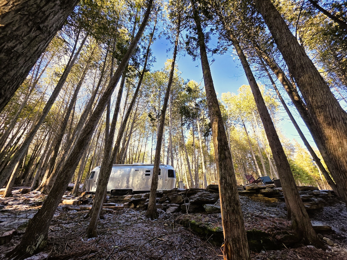 A quiet, adults-only two-person getaway tucked into the tall cedar trees. This private Airstream sits in its own wooded pocket of Dragonwood, offering peace, space to breathe, filtered water views, and the comfort of heat and air conditioning.